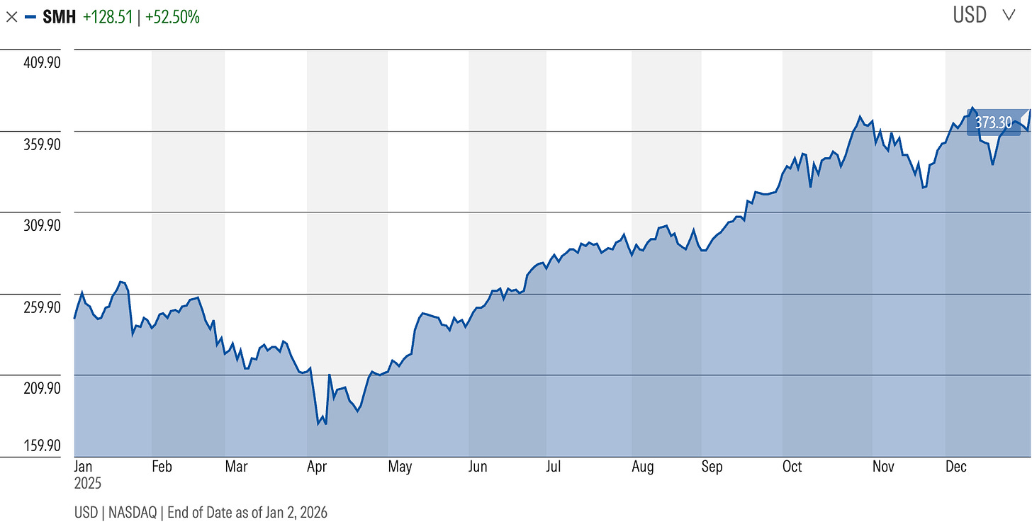 Si utilizamos como referencia el ETF VanEck Semiconductor (SMH), proxy sobre la industria de los semiconductores, el resultado es muy distinto: una revalorización de más del 50% en el mismo periodo.