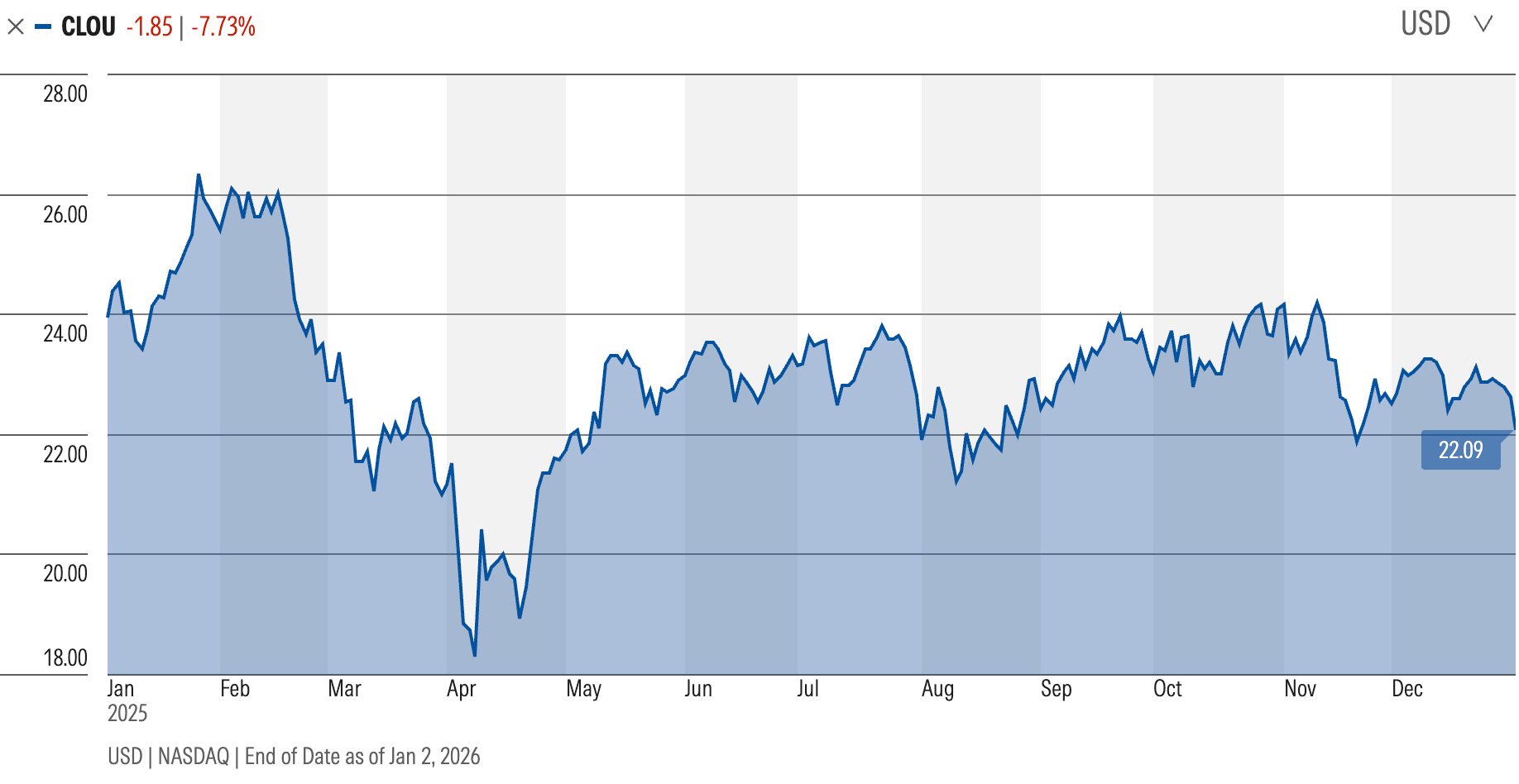 Dos buenos ETFs para seguir la industria son WisdomTree Cloud Computing Fund (WCLD) y Global X Cloud Computing ETF (CLOU), los cuales han terminado un -10% y -8% en el año.