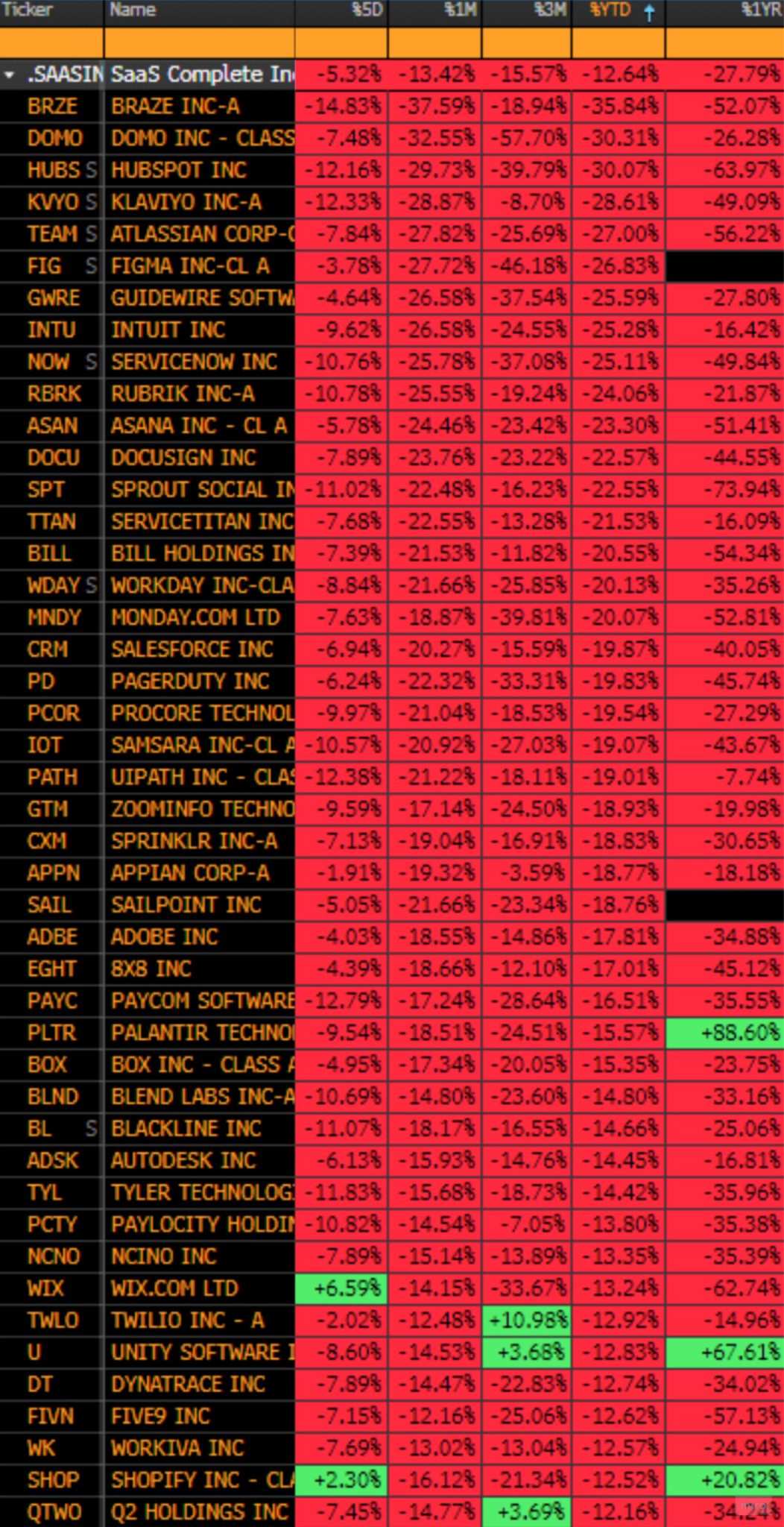 La sangría está siendo espectacular. Sirva como ejemplo la siguiente imagen, que muestra la variación en las cotizaciones de 2026 de algunos de los nombres más reconocidos del sector de Software as a Service, como HubSpot (-30%), Figma (-27%), ServiceNow (-25%) o Salesforce (-20%).